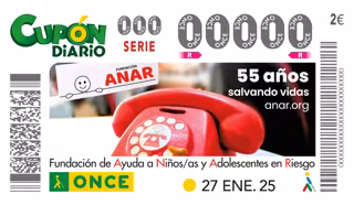 ONCE dedicará su cupón del lunes 27 de enero a la Fundación ANAR en reconocimiento a su labor desde hace 55 años "cambiando y salvando vidas de niños y adolescentes".