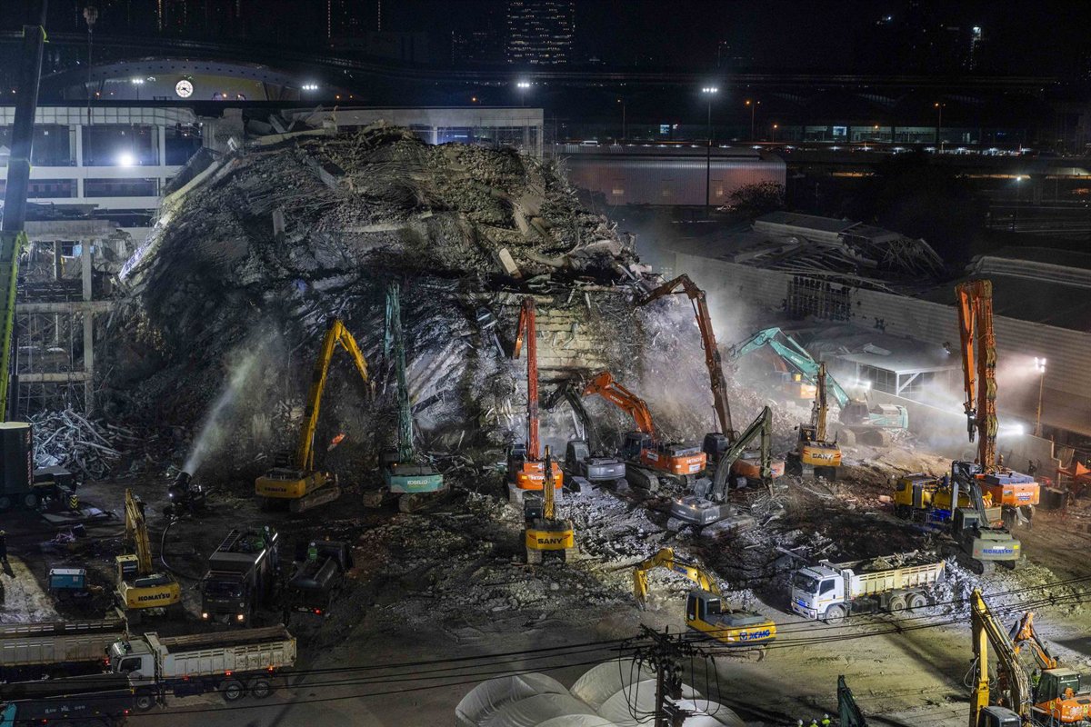 03 April 2025, Thailand, Bangkok: Heavy machinery is used to clear away wreckage from the State Audit Office construction site collapse in Bangkok, caused by the March 28th 7.7 earthquake in neighbouring Myanmar. - Adryel Talamantes/ZUMA Press Wir / DPA