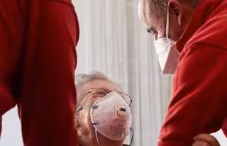 Voluntarios de Cruz Roja ayudan a una mujer mayor. - GIVING TUESDAY