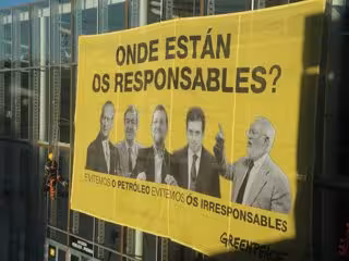En la fachada podía verse a dos activistas colgados de arneses, mientras que otros dos se colocaron en la parte superior del edificio con sendas pancartas en las que podía leerse "Evitemos el petróleo" y "Evitemos a los irresponsables".