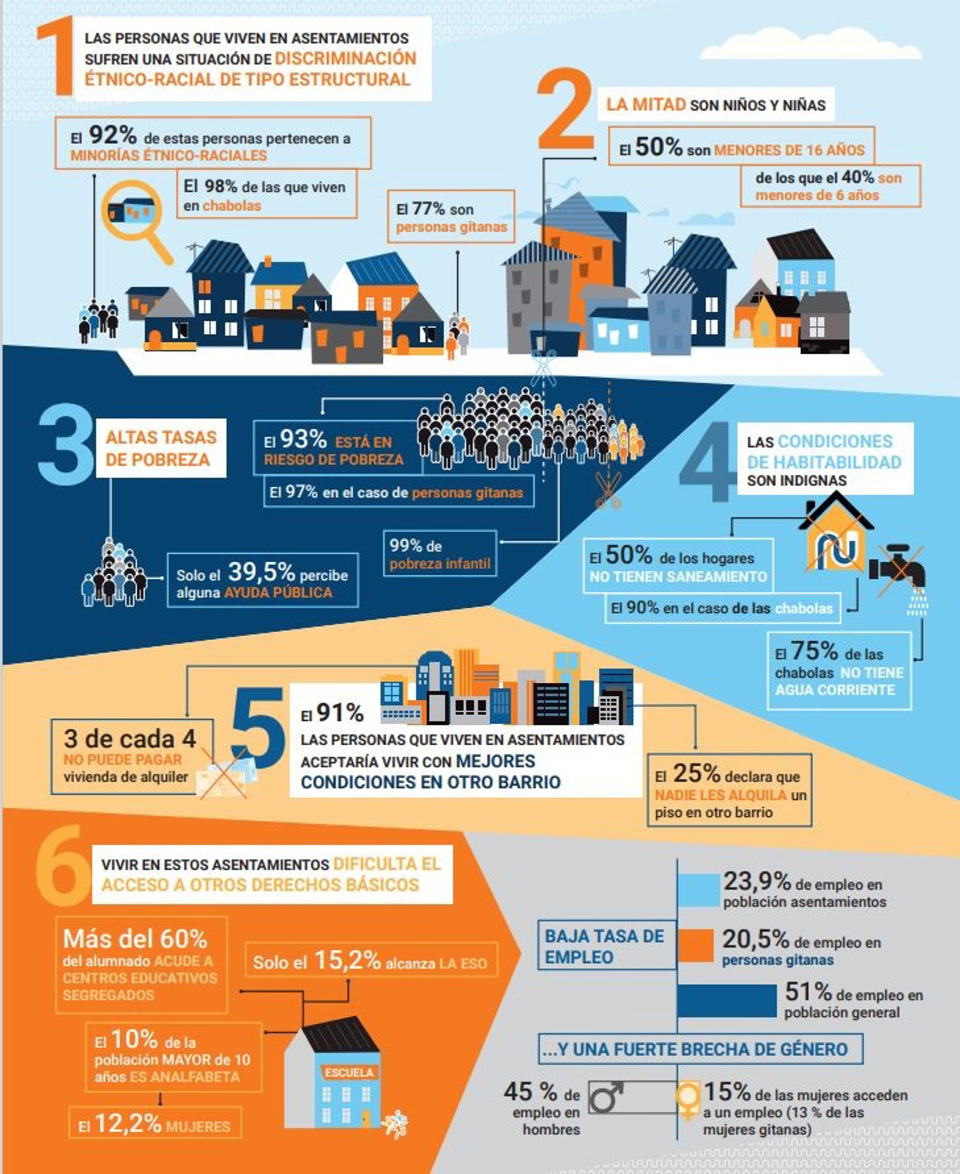 En cuanto al perfil de la población, el trabajo refleja que la práctica totalidad (92%) de las personas residentes en estos asentamientos pertenece a minorías étnico-raciales, siendo predominante (77% del total) la población gitana, seguida de la población árabe (13% del total). Para Fundación Secretariado Gitano, estos datos son indicadores de una situación de "racismo estructural".