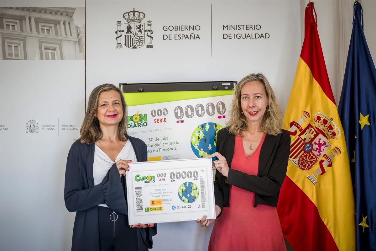 La ONCE dedica su cupón de este miércoles, 30 de julio, al Día Mundial contra la Trata de Personas, con el mensaje 'Ninguna persona está en venta', presentado por la vicepresidenta de la ONCE, Patricia Sanz, y la delegada del Gobierno contra la Violencia de Género, Carmen Martínez, en Madrid.