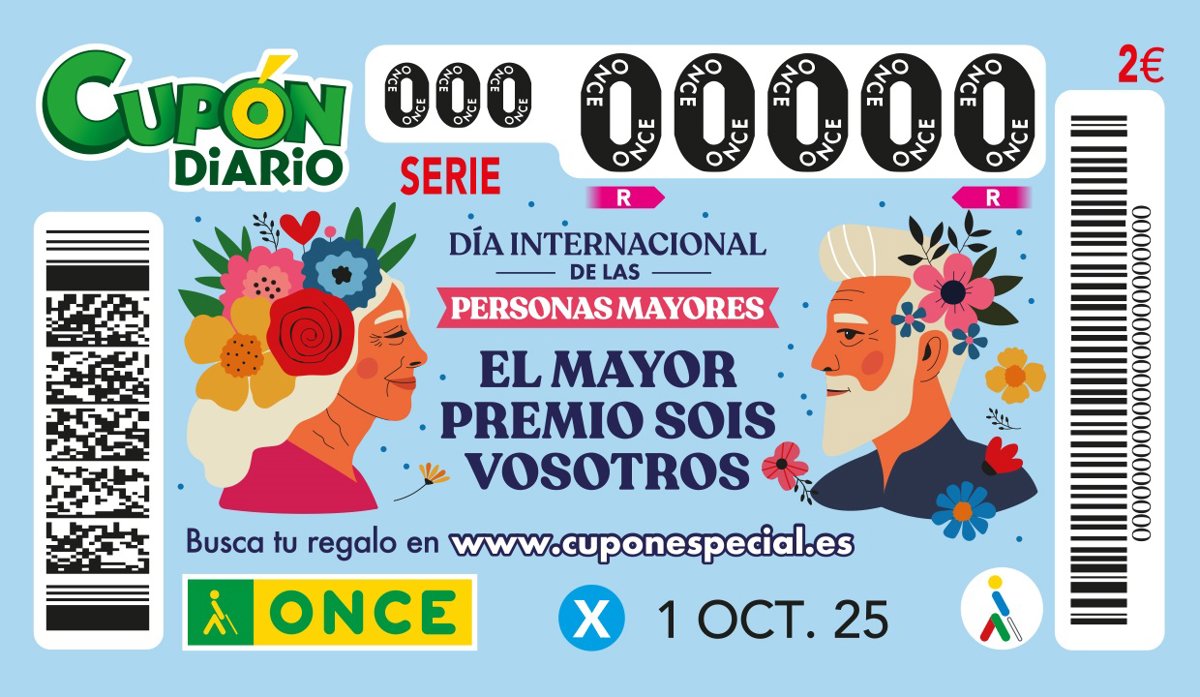 La ONCE dedicará su cupón del miércoles, 1 de octubre, al Día Internacional de las Personas Mayores, con el mensaje 'El mayor premio sois vosotros', según ha informado la organización.