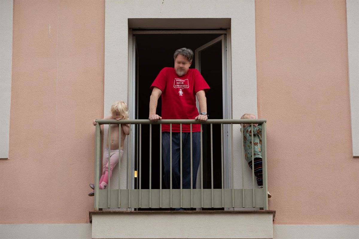 Un hombre y sus dos hijos pequeños se asoman al balcón durante el segundo día laborable del estado de alarma por el coronavirus, en Barcelona, a 17 de marzo de 2020. - David Zorrakino / Europa Press