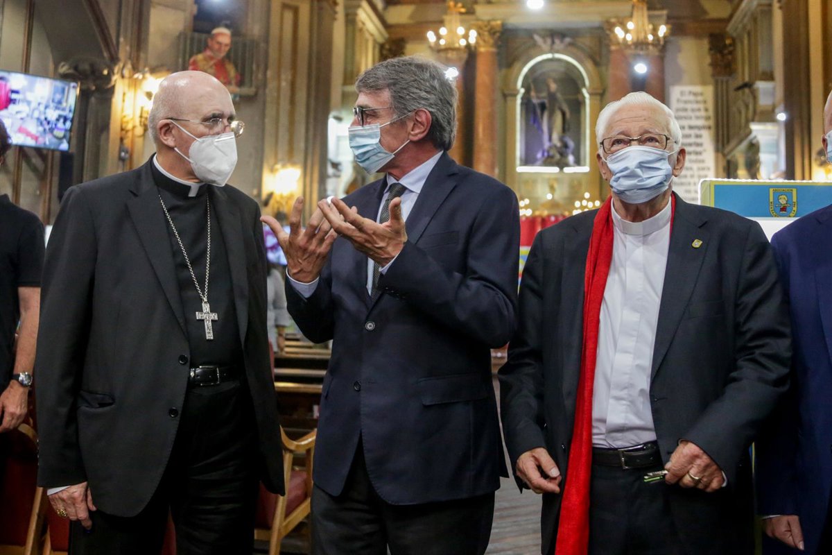 El Arzobispo de Madrid, Carlos Osoro; el presidente del Parlamento Europeo, David Sassoli; y el Padre Ángel, presidente de la ONG Mensajeros por la Paz, en la Iglesia de San Antón, Madrid (España), a 15 de julio de 2020. - Ricardo Rubio - Europa Press
