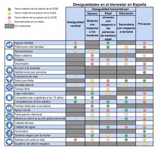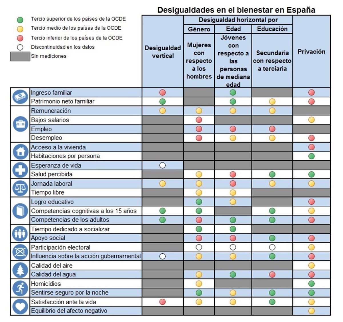 El trabajo detalla que España muestra una proporción comparativamente alta de personas que sufren privaciones en el bienestar, con 9 de 20 indicadores clasificados en el tercio inferior (es decir, más desfavorecidos) de los países de la OCDE. En concreto, España ostenta la segunda tasa más alta de desempleo (19,7%) y la tercera mayor incidencia de bajo logro escolar (42,6%) así como de bajo nivel de competencias de los adultos (22,5%).