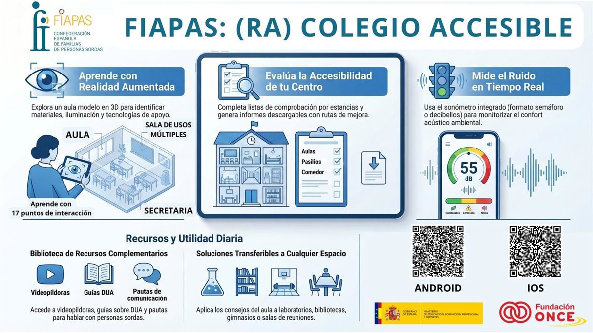 La Confederación Española de Familias de Personas Sordas - FIAPAS ha presentado este miércoles la 'app' FIAPAS (RA). Colegio Accesible, gratuita y disponible en iOS y Android, que permitirá a los docentes y a la comunidad educativa diagnosticar el nivel de accesibilidad de su centro para personas sordas.