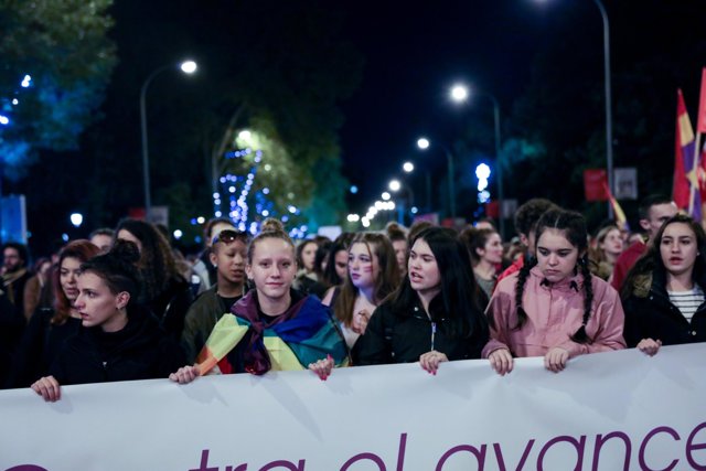 También han participado en la manifestación el líder de Más País, Íñigo Errejón, y la portavoz de Más Madrid, Rita Maestre, quien ha hecho un llamamiento para "no dar ni un paso atrás, ni un gesto, ni un guiño, ni una cesión a los ultras negacionistas que pretenden devolver a las mujeres al siglo XIX".