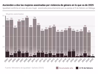 MADRID, 10 Feb. (EUROPA PRESS) - Un total de dos mujeres han sido asesinadas por violencia de género en lo que va de año 2025, tras confirmarse el caso de una mujer de 48 años asesinada presuntamente por su pareja el pasado 9 de febrero de 2025 en Málaga.