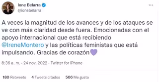"A veces la magnitud de los avances y de los ataques se ve con más claridad desde fuera. Emocionadas con el apoyo internacional que está recibiendo @Irene Montero y las políicas feministas que está impulsando. Gracias de corazón", ha escrito Belarra en su perfil de Twitter.