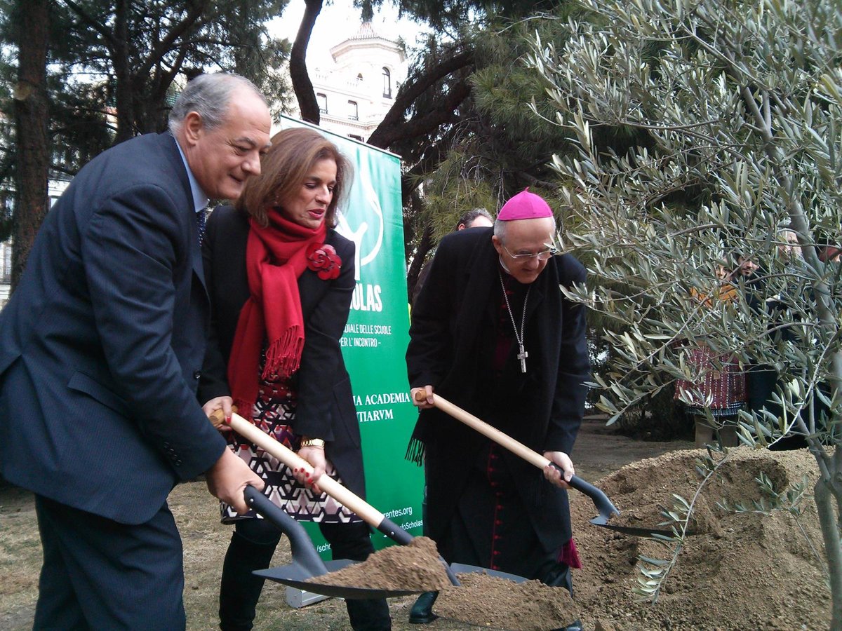 El arzobispo de Madrid y vicepresidente de la Conferencia Episcopal Española, Carlos Osoro, la alcaldesa de Madrid, Ana Botella, y el director mundial de Scholas Ocurrentes --iniciativa de educación por la paz del Papa Francisco--, Jose María del Corral, han plantado este martes en la madrileña Plaza del Descubrimiento, un olivo como símbolo de paz con motivo de la presentación en España de Scholas.