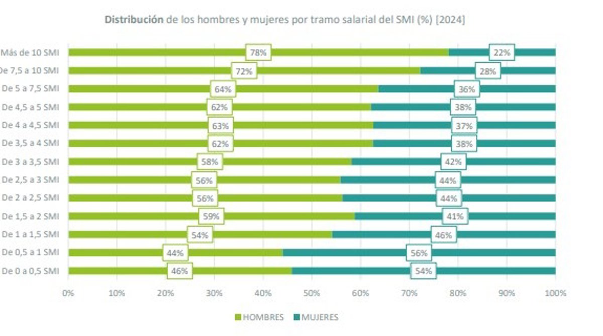 Al contrario, el 1,8 % de las mujeres que trabajan perciben más de 5 veces el SMI, frente al 3,2 % de los hombres. "Tres de cada cuatro personas que cobran al menos 7,5 veces el SMI son hombres, mientras que las mujeres solo son mayoría en los salarios más pobres, por debajo del SMI", ha apuntado Pérez.