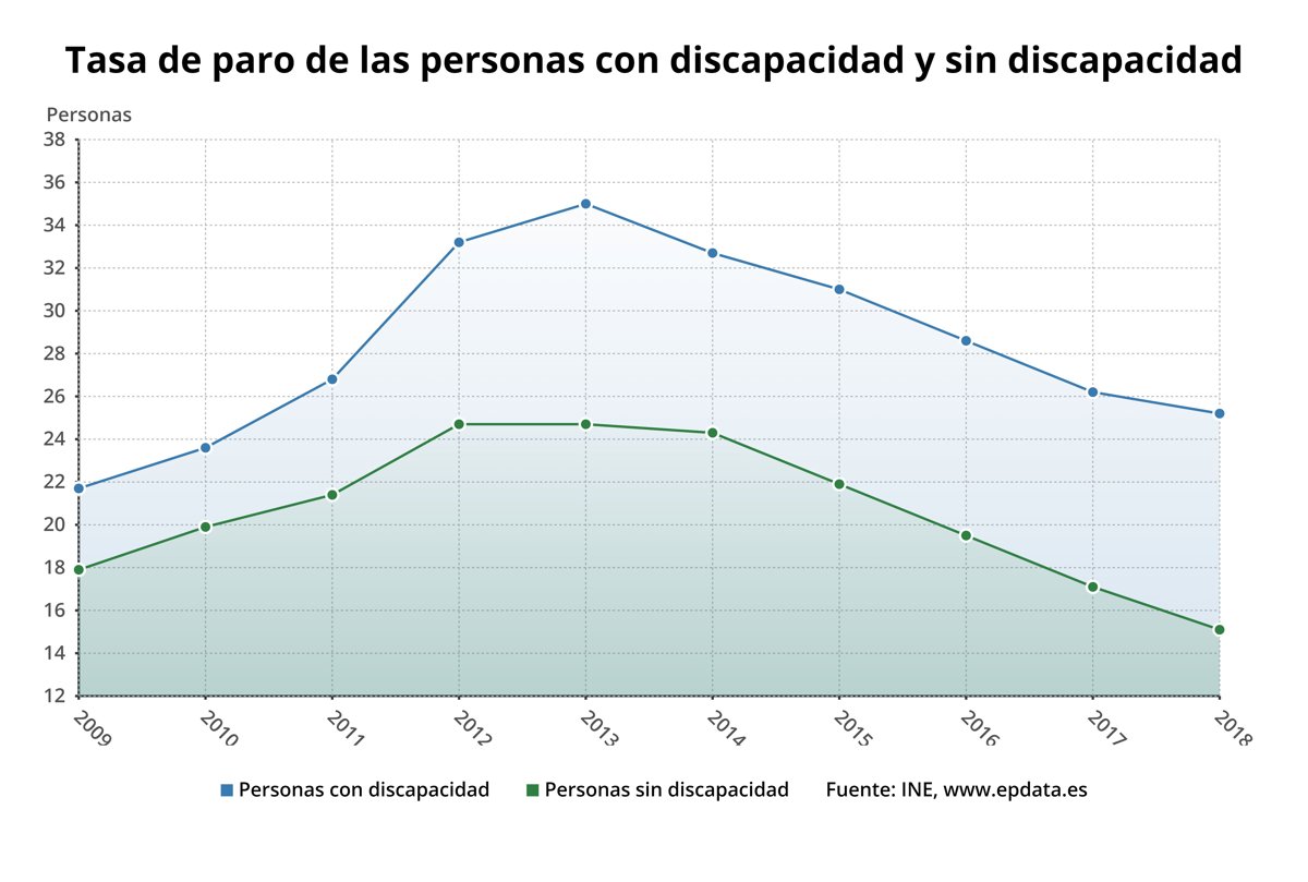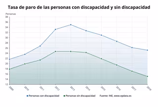 Para el resto de la población de 16 a 64 años, la diferencia fue de 12,8 puntos. Por su parte, la tasa de paro de las mujeres con discapacidad fue inferior a la de los hombres en 0,4 puntos. Para las mujeres sin discapacidad fue mayor en 3,5 puntos.