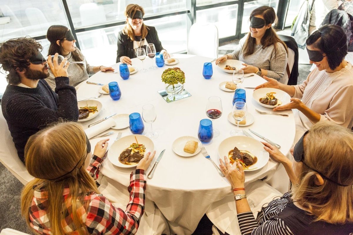 "Es una experiencia que marca. Es una situación complicada porque no sabes qué estás comiendo ni sabes qué tienes que cortar, es muy difícil hacer eso sin poder ver", manifestaba un joven tras chocar su copa a ciegas con otras tres personas.