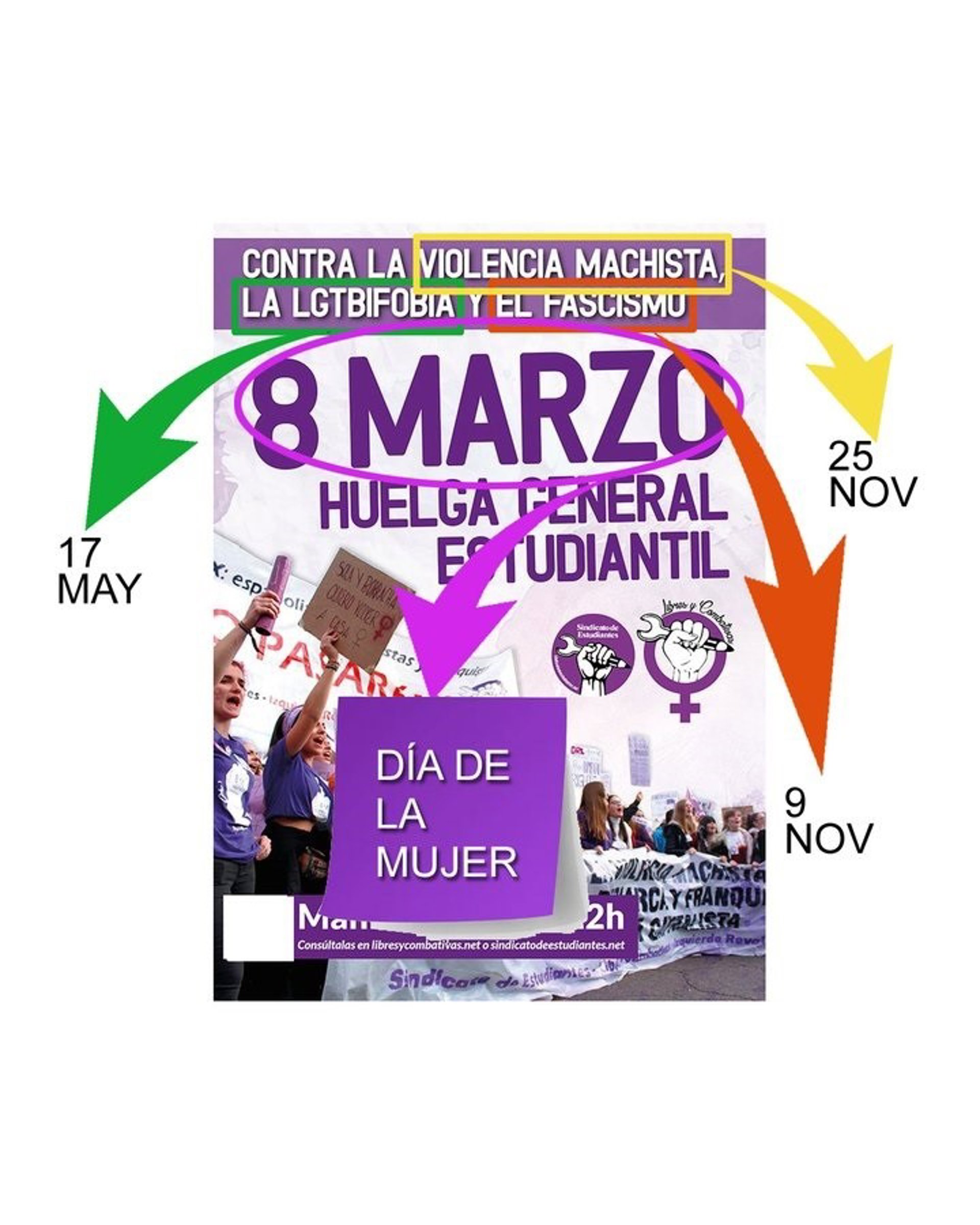 Así, apuntan, el día contra la violencia machista se conmemora el 25 de noviembre, el de la lucha contra la LGTBIfobia en 17 de mayo y el día contra el fascismo el 9 de noviembre.