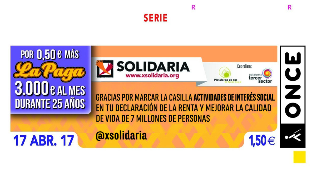 La casilla de Actividades de Interés Social de la Declaración de la Renta, conocida como la 'X Solidaria', protagoniza el cupón de la ONCE del próximo lunes 17 de abril, de modo que cinco millones y medio de cupones animarán a marcar esta casilla.