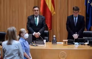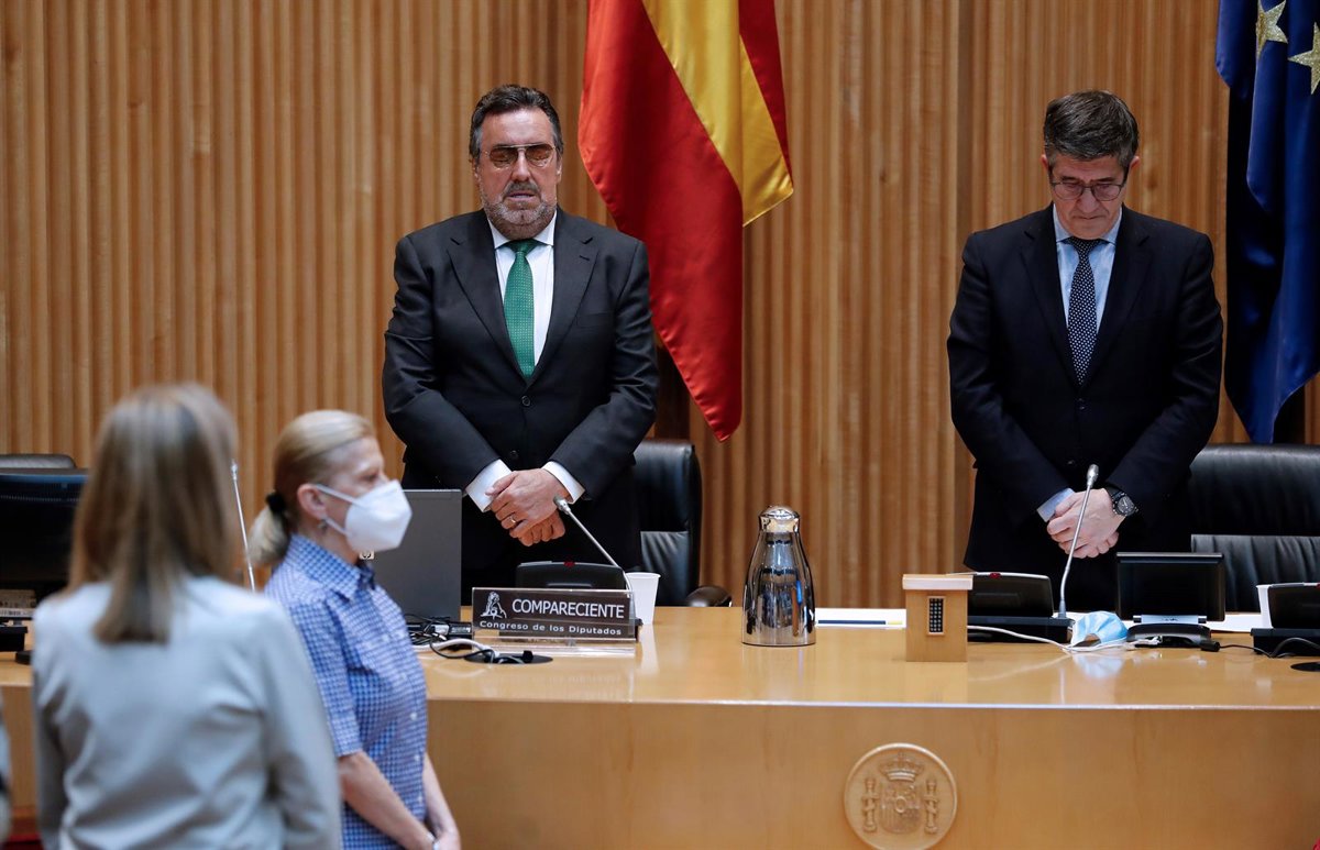 El presidente la ONCE, Miguel Carballeda (i) y el presidente de la Comisión para la Reconstrucción, el socialista Patxi López (d) durante el minuto de silencio por las víctimas del coronavirus antes del comienzo de dicha comisión celebrada este martes en - Pool