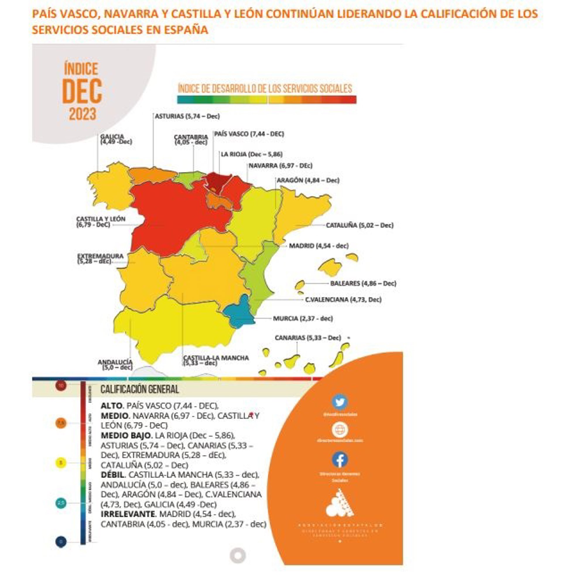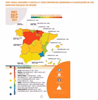 La entidad, que ha presentado el resultado del Índice DEC 2023 que describe la situación de los Servicios Sociales, ha llamado la atención sobre las desigualdades territoriales de estos servicios, tanto en materia de gasto como de número de profesionales por habitante, que confirman a País Vasco, Navarra y Castilla y León como las comunidades con mejor calificación en cuanto a prestaciones. Andalucía ofrece, por ejemplo, 21 veces má ayuda a domicilio que Extremadura y el número de habitantes por profesional de servicios sociales comunitarios en Canarias (5.645) es más de ocho veces superior al de Navarra (684).