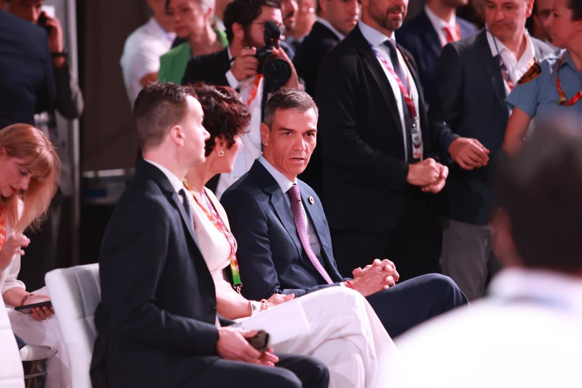 El presidente del Gobierno, Pedro Sánchez, junto al embajador de España ante la ONU, Héctor Gómez y la ministra de inclusión, Seguridad Social y Migraciones, Elma Saiz, en la IV Conferencia Internacional sobre la Financiación para el Desarrollo de la ONU. - ROCÍO RUZ- EUROPA PRESS