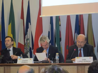 Robles, Powell y López-Dóriga en el seminario de cooperación reembolsable