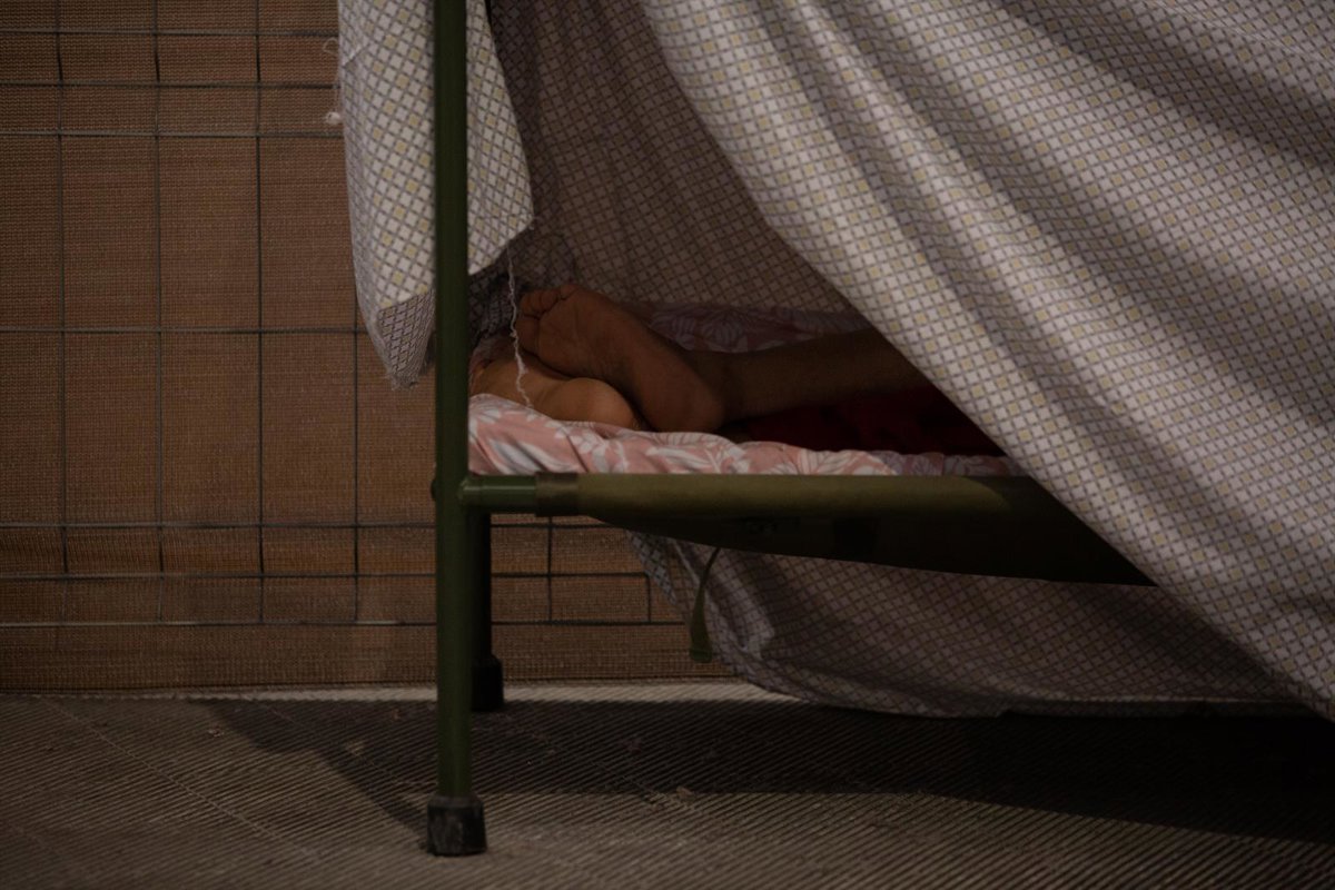 Archivo - Una persona sin hogar descansa en el albergue de Fira Barcelona que se habilitó por la pandemia del coronavirus. - David Zorrakino - Europa Press - Archivo