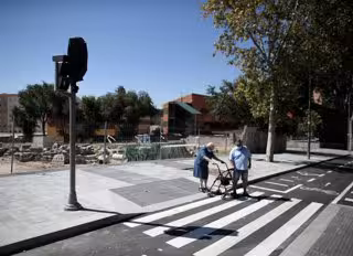 Una pareja de ancianos en las inmediaciones del IES Gran Capitán, donde se están realizando obras, en Madrid (España), a 4 de septiembre de 2020. Las AMPAS de los colegios Tomás Bretón y Joaquín Costa y del instituto Gran Capitán, en el entorno del anti - Eduardo Parra - Europa Press