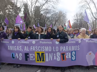 Así lo ha pedido Montero en el marco de la manifestación de la Comisión 8M por el Día Internacional de la Mujer, en la que participa junto a la secretaria general de Podemos, Ione Belarra, tras una pancarta en la que se lee 'Amigas, al fascismo lo paramos las feministas'.