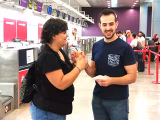 Javier, junto a su mediadora Lorena, en el aeropuerto antes de partir a Londres - EUROPA PRESS