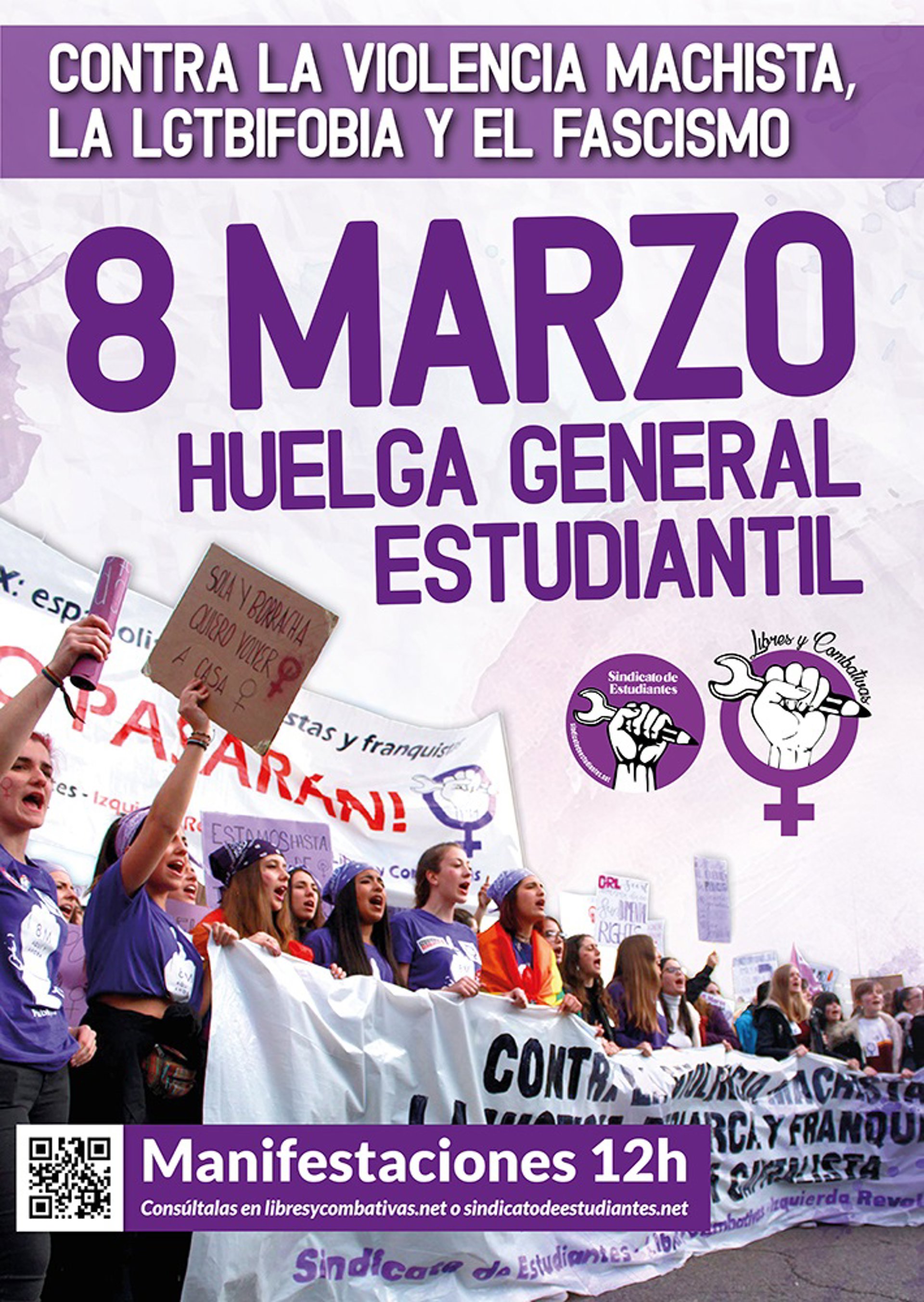 Las asociaciones Libres y Combativas y Sindicato de Estudiantes han convocado para el próximo 8 de marzo, Día Internacional de la Mujer, una huelga general estudiantil para protestar contra "la violencia machista, la LGTBIfobia y el fascismo", y manifestaciones a las 12.00 horas en varias ciudades del país.