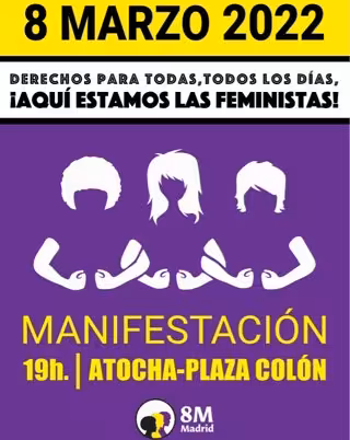La Comisión 8M del movimiento feminista de Madrid ha convocado la manifestación para el próximo 8 de marzo bajo el lema 'Derechos para todas, todos los días. Aquí estamos las feministas', y ha programado un recorrido desde la plaza de Atocha hasta la de Colón.