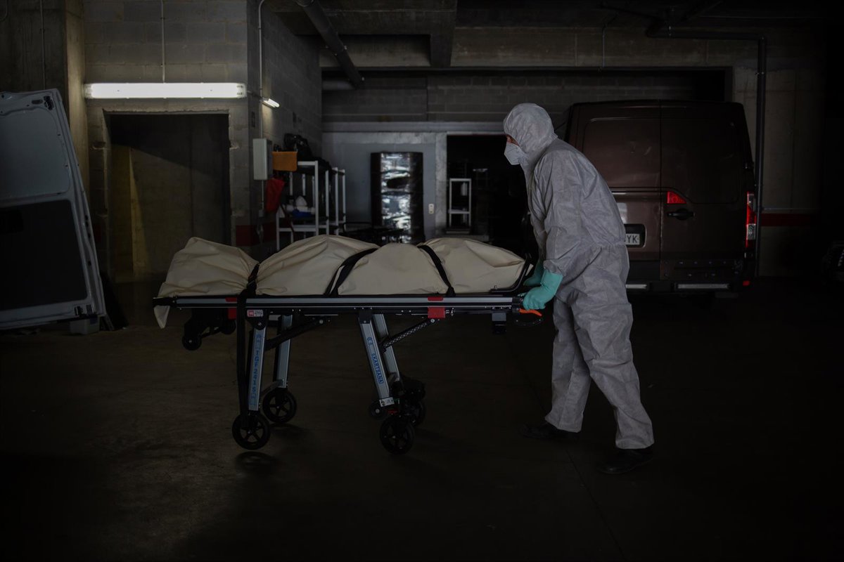 Varios operarios protegidos de los Servicios Funerarios Memora trasladan un cuerpo de una residencia de ancianos. En Girona, Cataluña, (España), a 6 de mayo de 2020. - David Zorrakino - Europa Press - Archivo