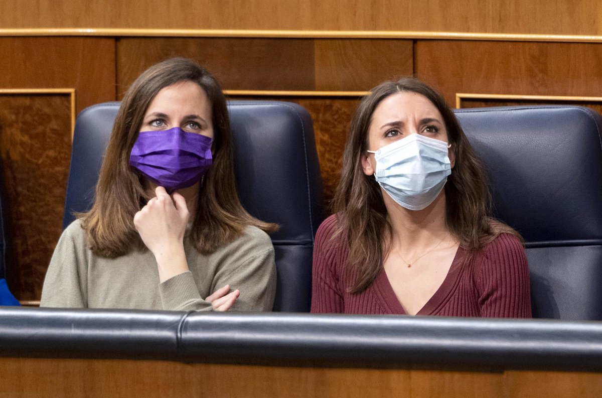 La secretaria general de Podemos y ministra de Derechos Sociales y Agenda 2030, Ione Belarra (i), y la ministra de Igualdad, Irene Montero (d), en la sesión plenaria del Congreso este miércoles 9 de marzo de 2022 - Alberto Ortega - Europa Press