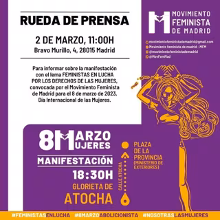 A través de un comunicado, recogido por Europa Press, el Movimiento Feminista de Madrid advierte que su convocatoria "se distancia de quienes usurpan el nombre del feminismo para ejecutar políticas neoliberales contrarias a los derechos de las mujeres, y el Día Internacional de la Mujer como elemento de propaganda partidista".