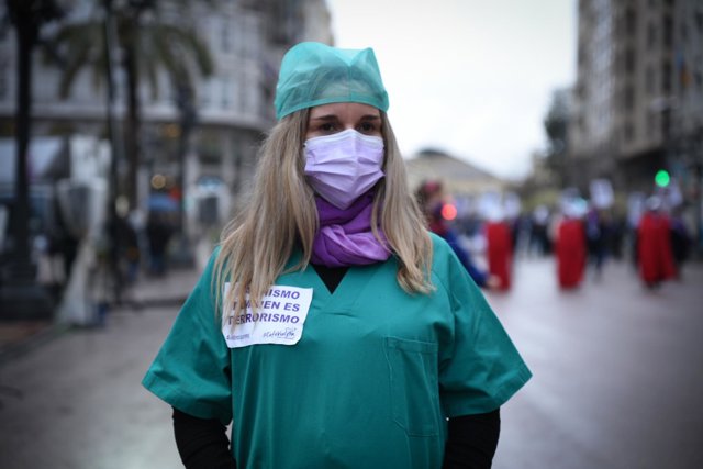 En Galicia, las principales ciudades gallegas (Santiago de Compostela, Ourense, Vigo, Ferrol, A Coruña, Pontevedra y Lugo) también han acogido varias movilizaciones de mujeres, en un ambiente festivo y de reivindicación, con el lema 'Sen coidados non hai vida --Sin cuidados no hay vida--', preludio de las movilizaciones centrales convocadas por Galegas 8M para la tarde, con mascarillas y las distancias de seguridad.