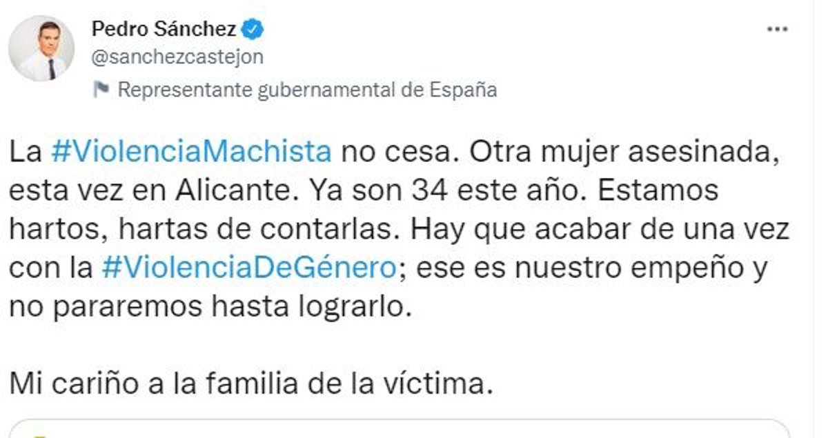 "La #ViolenciaMachista no cesa. Otra mujer asesinada, esta vez en Alicante. Ya son 34 este año. Estamos hartos, hartas de contarlas", ha escrito el jefe del Ejecutivo en su perfil de Twitter.