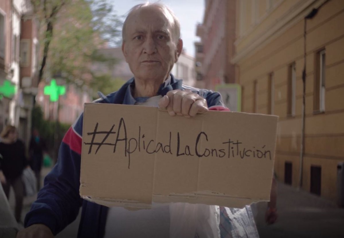 En España hay 31.000 personas viviendo en la calle, y, por ello, esta ONG ha difundido un vídeo en el que siete personas sin hogar recitan el artículo 47 de la Carta Magna y muestran un cartón con el lema '#AplicadLaConstitución'.