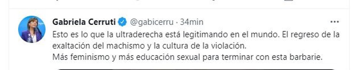 "Más feminismo y más educación sexual para terminar con esta barbarie", ha escrito la argentina Gabriela Cerruti en su perfil de la red social.