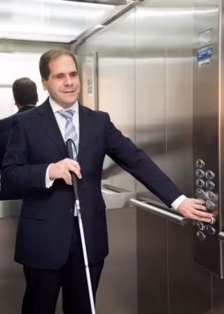 Una persona con ceguera acciona el botón de un ascensor - FUNDACIÓN ONCE