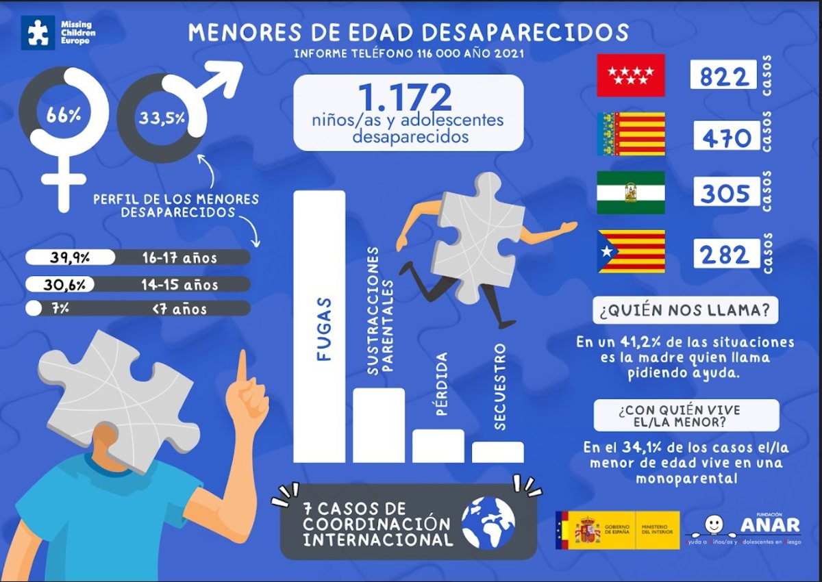 El Teléfono ANAR para Casos de Niños Desaparecidos 116000 recibió 2.892 peticiones de ayuda por desapariciones en 2021 que desembocaron en la atención de 1.172 casos, según el Informe que ha publicado ANAR con motivo del Día Internacional de los Menores de Edad Desaparecidos, que se celebra este miércoles 25 de mayo.