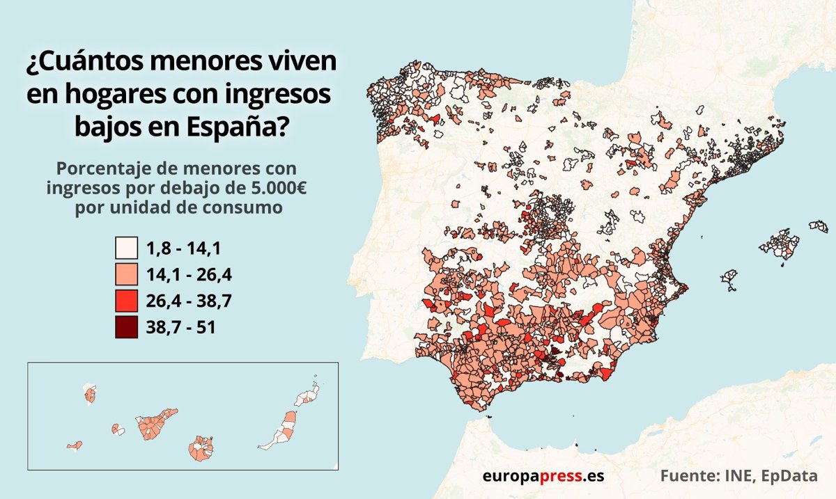 Mapa de España según menores que viven en hogares con bajos ingresos - EPDATA