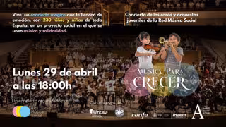 El Auditorio Nacional de Música de Madrid será el escenario de "Música para Crecer", el tercer concierto de la Red Música Social, cuya segunda edición se realizó hace dos años en el Palau de la Música de Barcelona. Esta sala concentrará un total de 230 músicos provenientes de proyectos sociomusicales de Barcelona, Bilbao, Madrid, Vitoria y Zaragoza, con un repertorio recorrerá diversos estilos y compositores, pasando por piezas sudafricanas, otras populares de la mano de los conocidos Manuel Artés y Adrià Aguilera, algunas clásicas como las compuestas por Bizet o Sibelius, y alguna más contemporánea como el Aleluya de Leonard Cohen.
