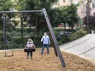 Una niña y su abuelo juegan en los columpios en el interior de la manzana Montserrat Figueras en el día de la reapertura de las zonas de juego. - EUROPA PRESS - Archivo