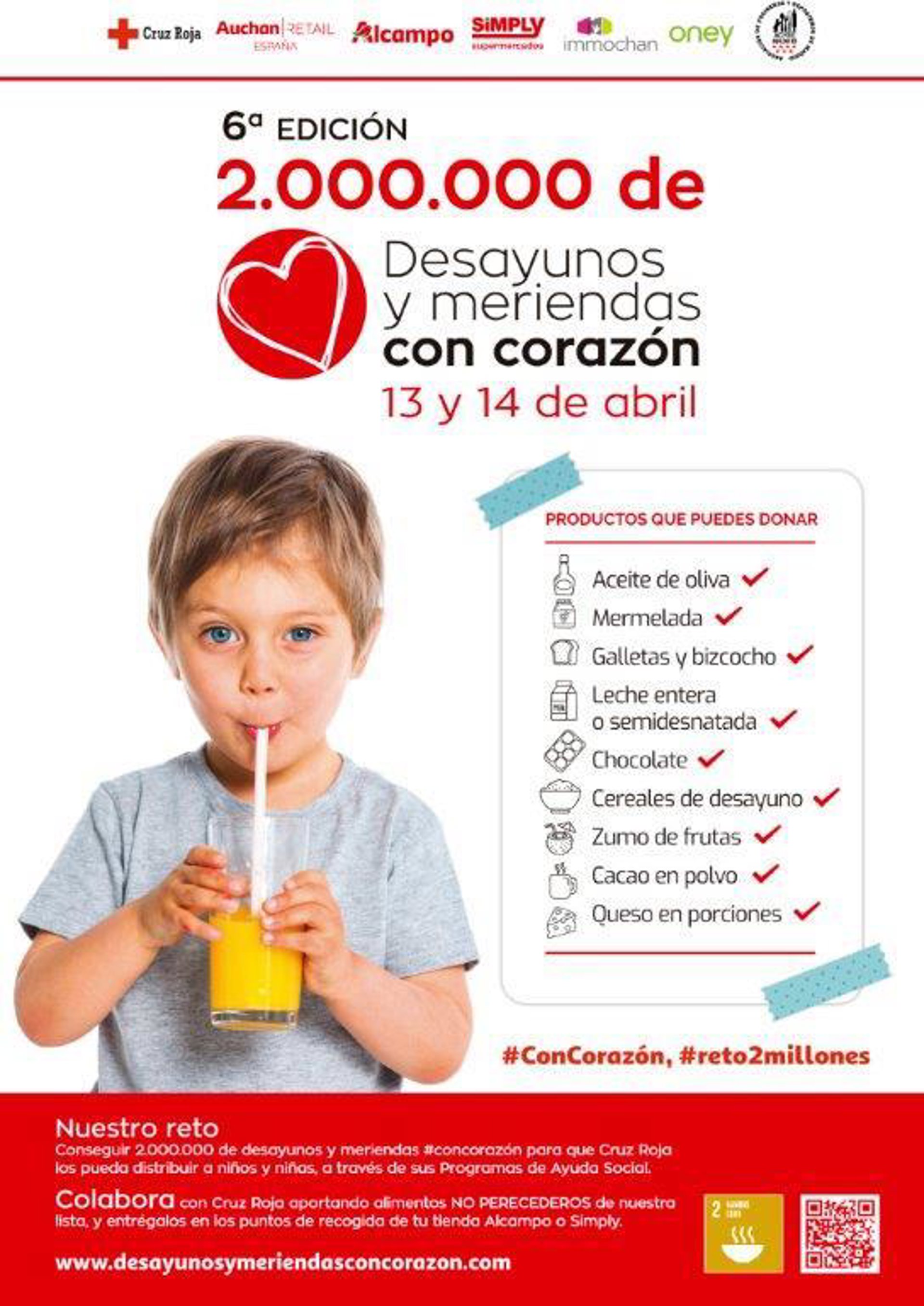 Cruz Roja pone en marcha este viernes 13 de abril la campaña 'ConCorazón' con el reto de recoger dos millones de desayunos y meriendas para niños que viven en familias con dificultades.