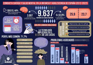 Según el Estudio sobre Conducta Suicida y Salud Mental en la Infancia y la Adolescencia en España (2012-2022), realizado a partir de las casi 600.000 peticiones de ayuda recibidas a través de sus Líneas de Ayuda, a lo largo de los diez últimos años, ANAR ha ayudado a 9.637 menores de edad que expresaron conductas suicidas, ya fuera ideación o intento de suicidio.