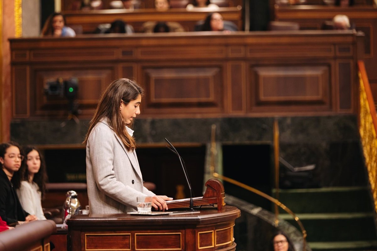 "Reivindicamos que dejemos de ser productos en Internet y que podamos ser nosotras mismas en un entorno digital en el que no tengamos miedo", ha reclamado Leonor, de 12 años, procedente de Trebujena (Cádiz), que participa en Pantallas Amigas. Así se ha pronunciado desde la tribuna, ante sus compañeros, ante los diputados de distintos grupos parlamentarios y ante la ministra de Juventud e Infancia, Sira Rego, también presente en la Cámara Baja.