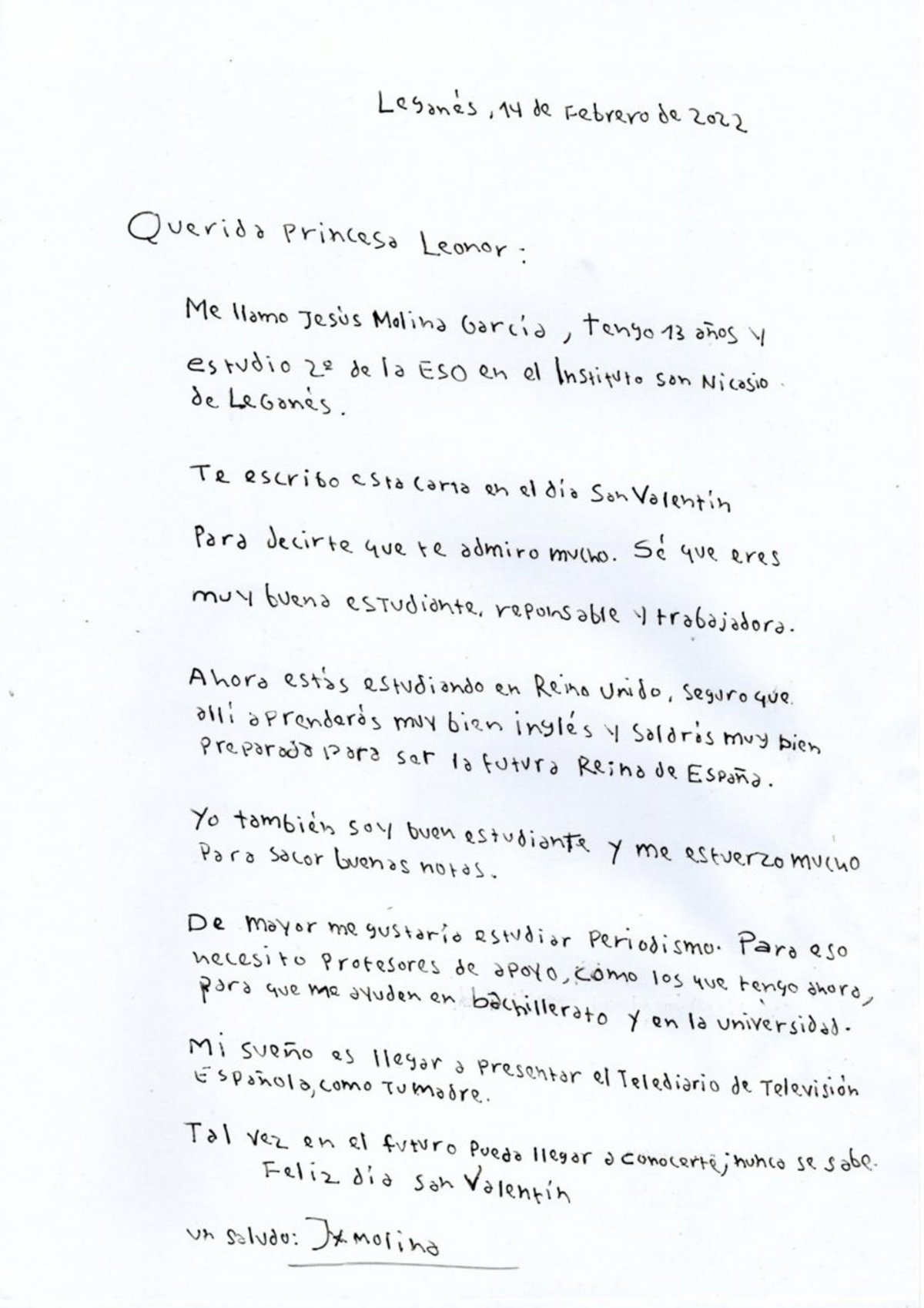 Jesús Molina, un niño de 13 años con autismo, ha escrito una carta dirigida a la princesa Leonor, en el marco de una actividad propuesta por los profesores del instituto San Nicasio de Leganés para que los alumnos pudieran realizar una muestra de admiración, amistad o respeto por alguien, con motivo del Día de San Valentín.