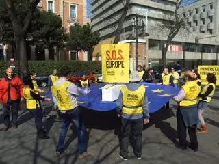Con un bandera de la Unión Europea de cinco metros y un ataúd de cartón en medio, en el que se podía leer 'SOS Europa', los activistas han criticado las "restrictivas" políticas de control fronterizo de los Estados miembros de la UE y han alertado de que éstas "amenazan la vida y los derechos de migrantes, solicitantes de asilo y refugiados".