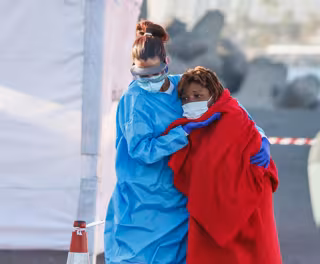 Archivo - Una sanitaria ayuda a una mujer migrante a desembarcar de la guardamar Talía a 25 de agosto de 2021, en Arguineguín (Gran Canaria), Islas Canarias. - MAURICIO DEL POZO - Archivo