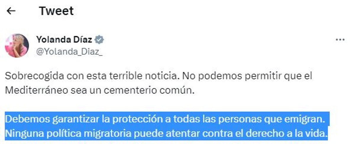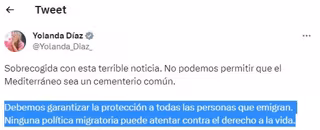 "Ninguna política migratoria puede atentar contra el derecho a la vida", ha añadido Díaz en su mensaje.