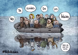 Diez ONG y medio centenar de artistas gráficos reclaman con viñetas que las personas refugiadas no caigan en el olvido y rinden homenaje al recientemente fallecido Antonio Fraguas 'Forges', que hizo célebre el #NoTeOlvides.
